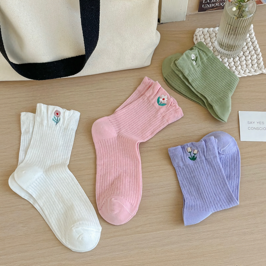 2-Pack Thin Solid Color Women's Socks with Floral Embroidery