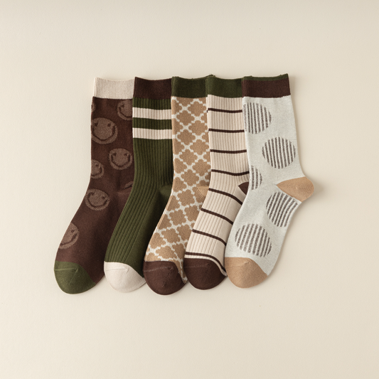 2-Pack Versatile Retro Green Coffee Cotton Socks for Women: Striped Design with Smiley Faces – Soft & Stylish