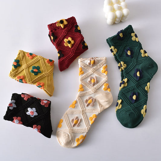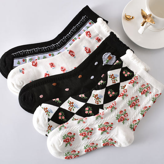 5-Pack Cute Floral Socks: Soft Knitted Cotton Elegance for Women