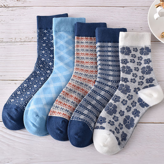 5-Pack Blue Floral Socks: Vintage Knitted Crew Elegance for Women