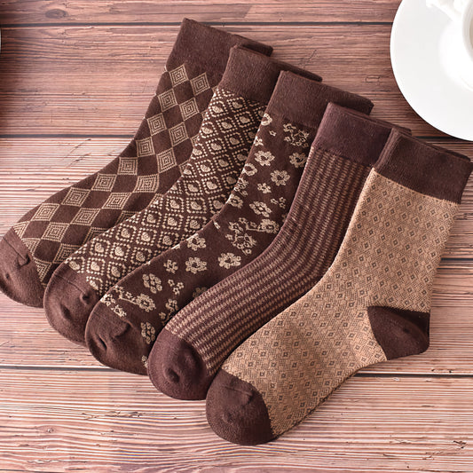 5-Pack Retro Fall/Winter Coffee Brown Cotton Socks for Women