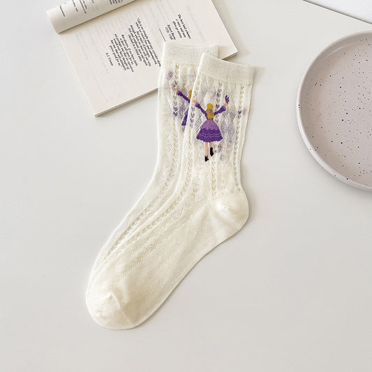 2-Pack Women’s Sheer Cotton Crew Socks with Illustrated Girls