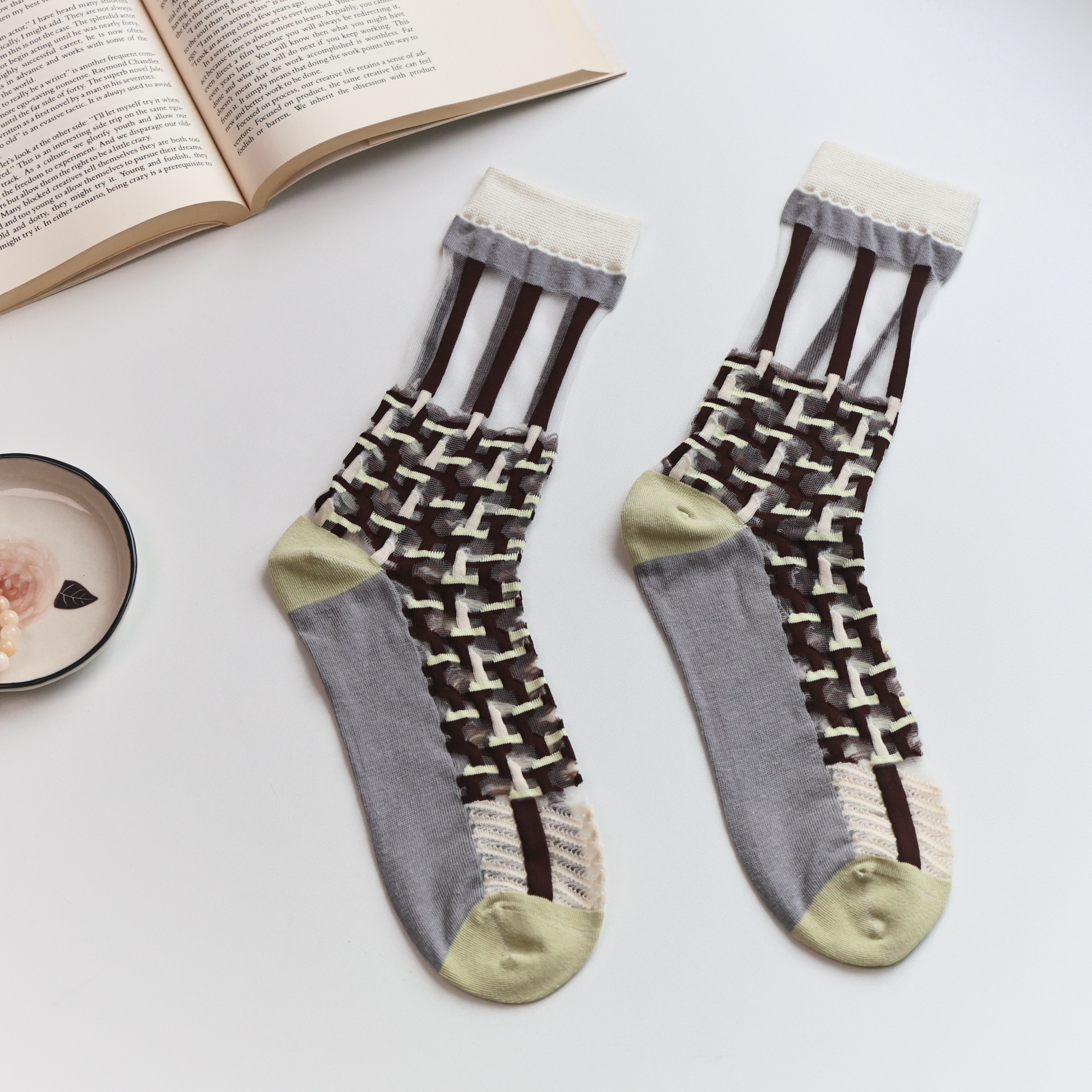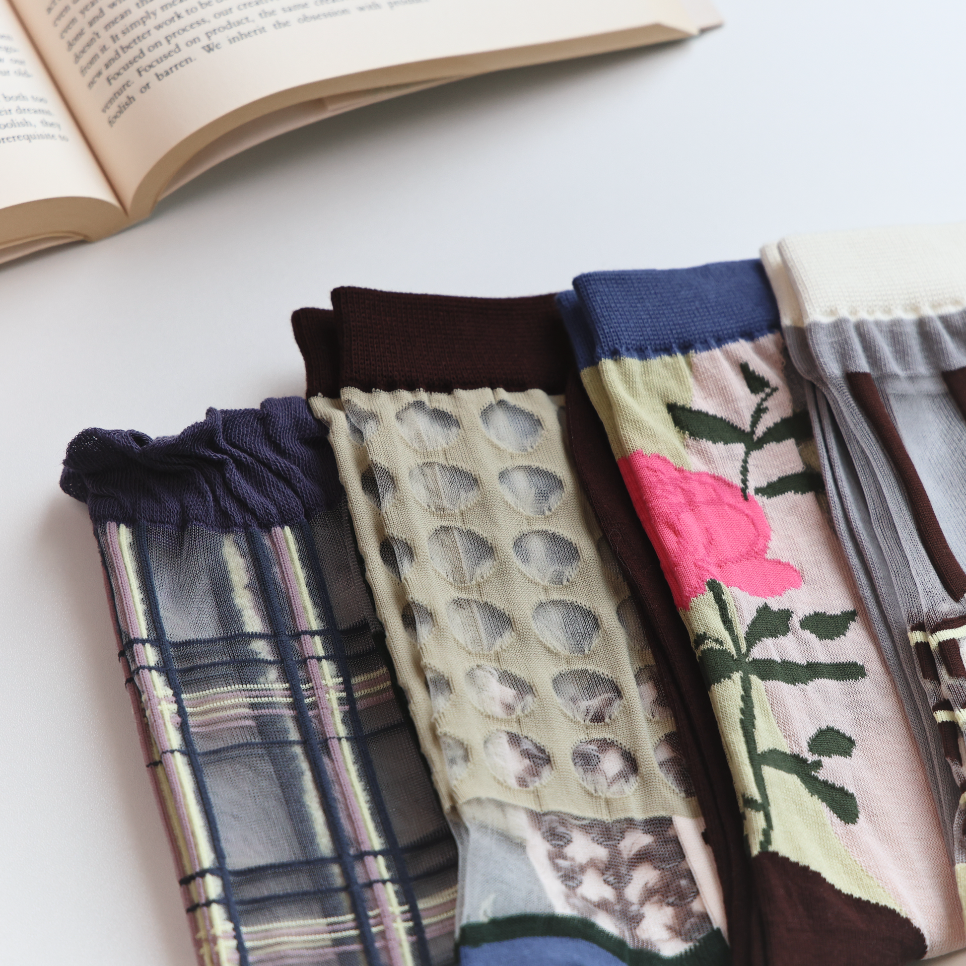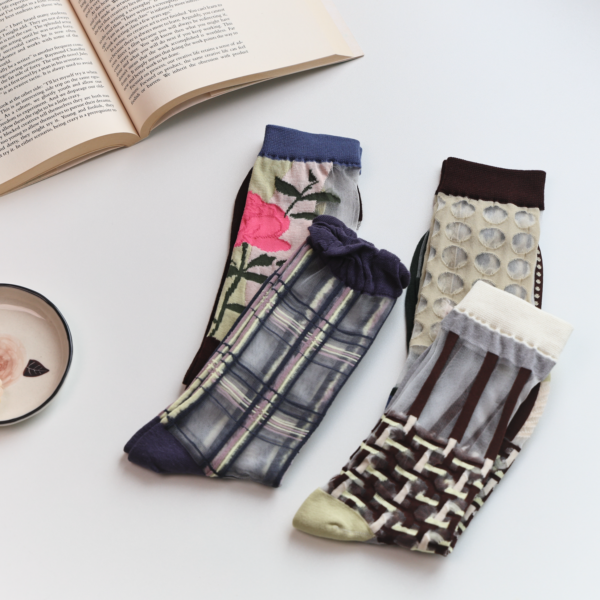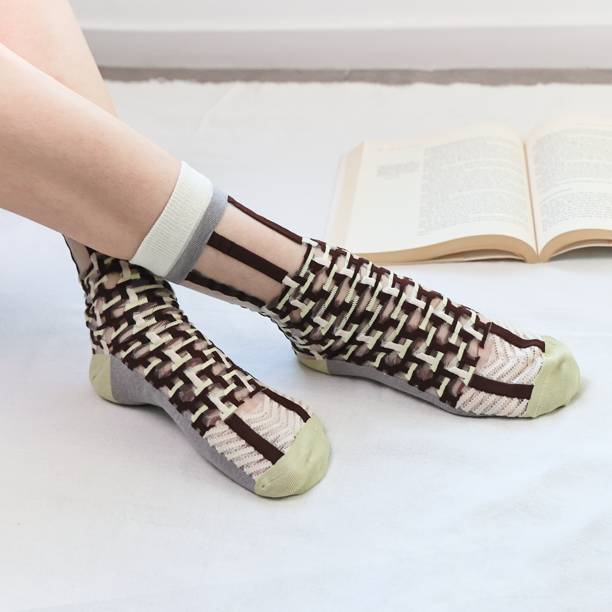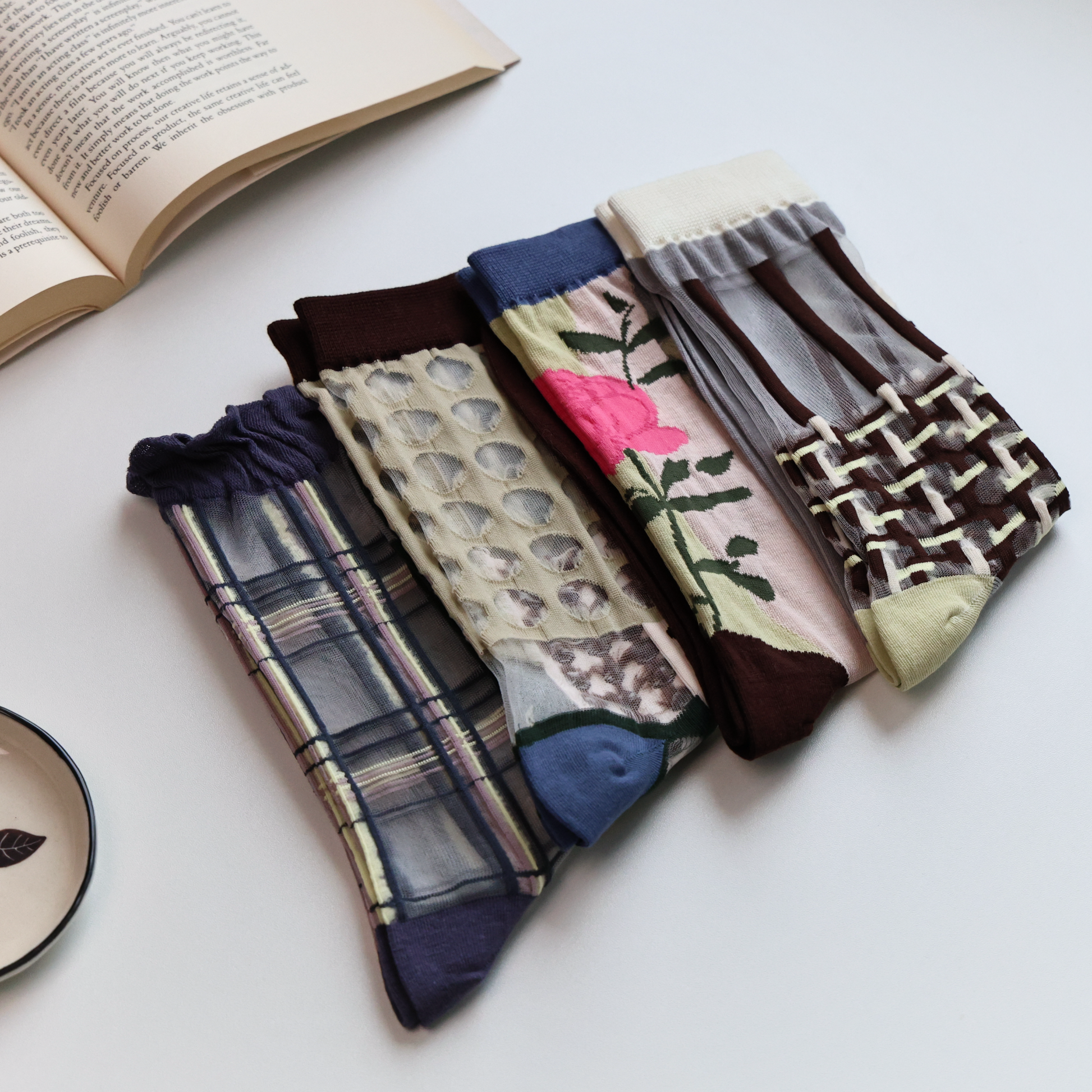 Add a vintage twist to your summer look with these retro sheer socks. Featuring breathable cotton-blend comfort and delicate floral and geometric details – perfect for everyday charm.