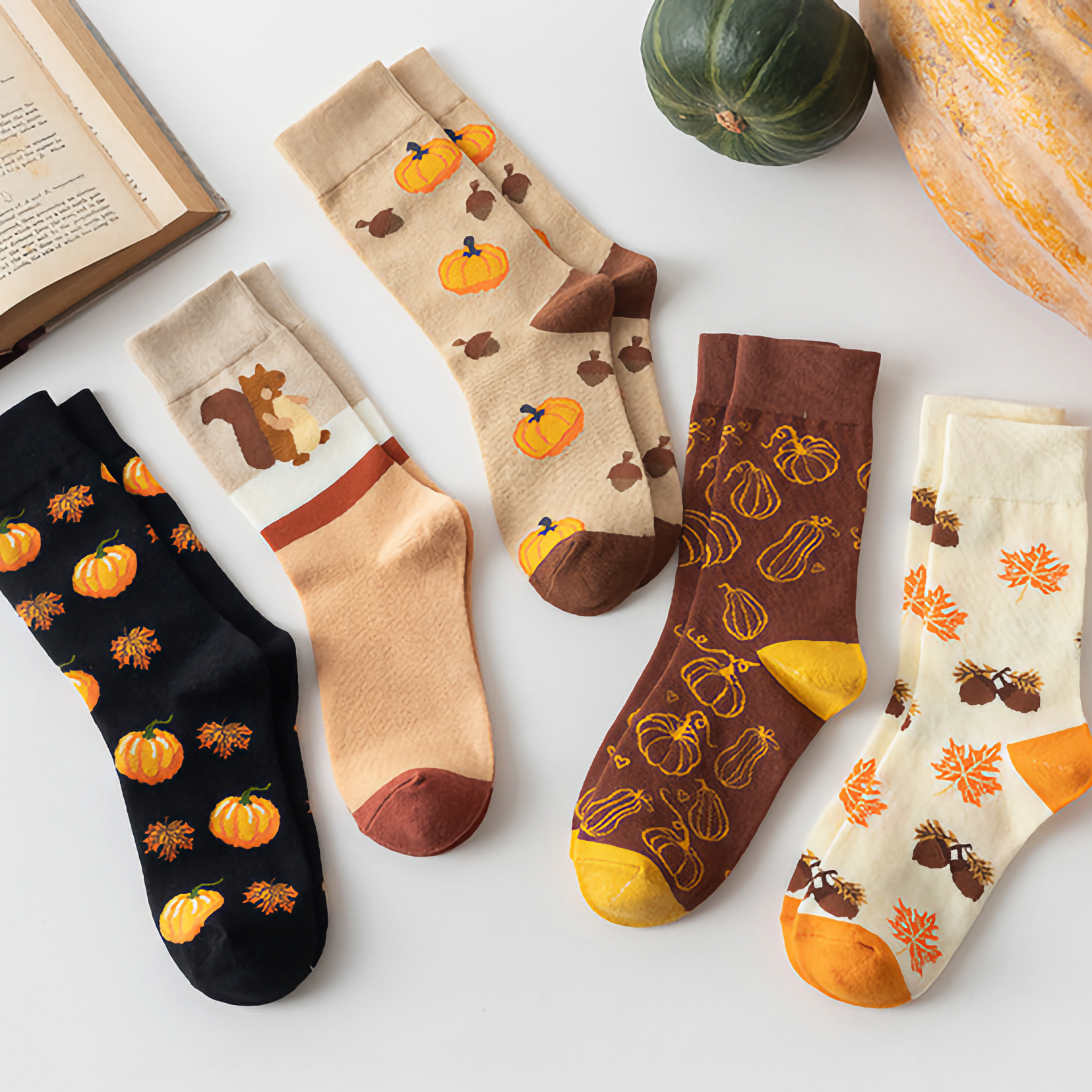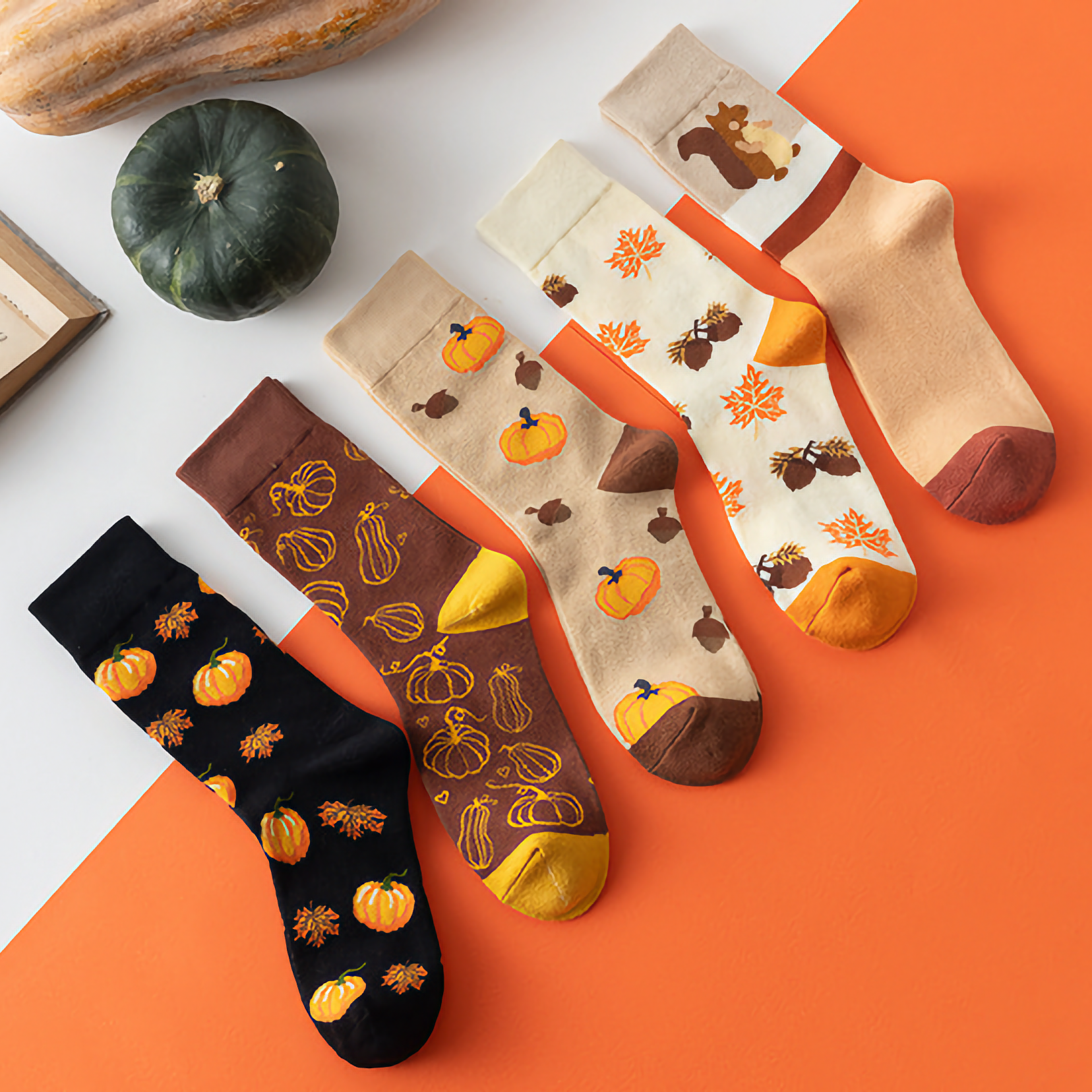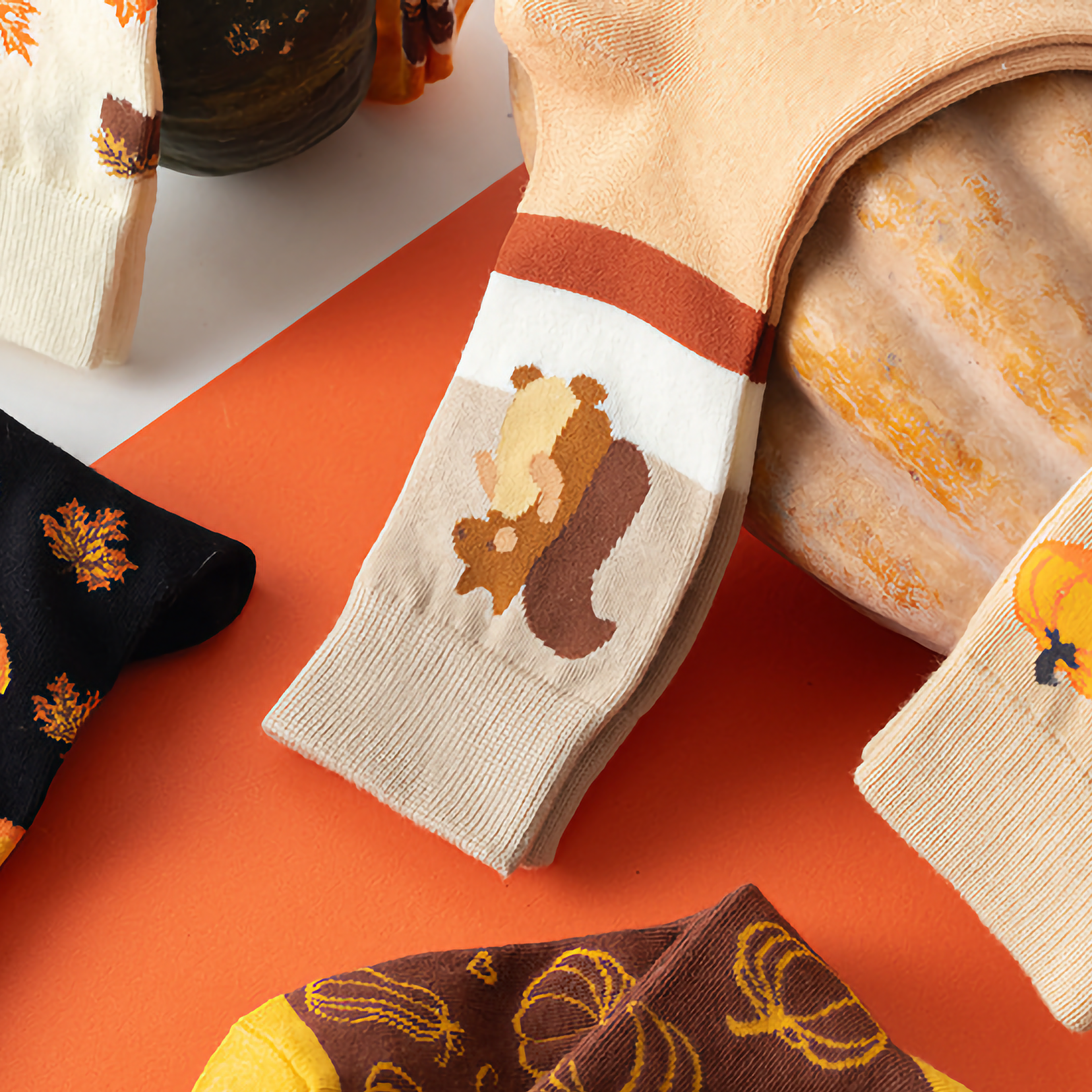 Celebrate Halloween with unisex cotton crew socks featuring fun pumpkin and squirrel cartoon designs. Perfect for festive flair and comfort.