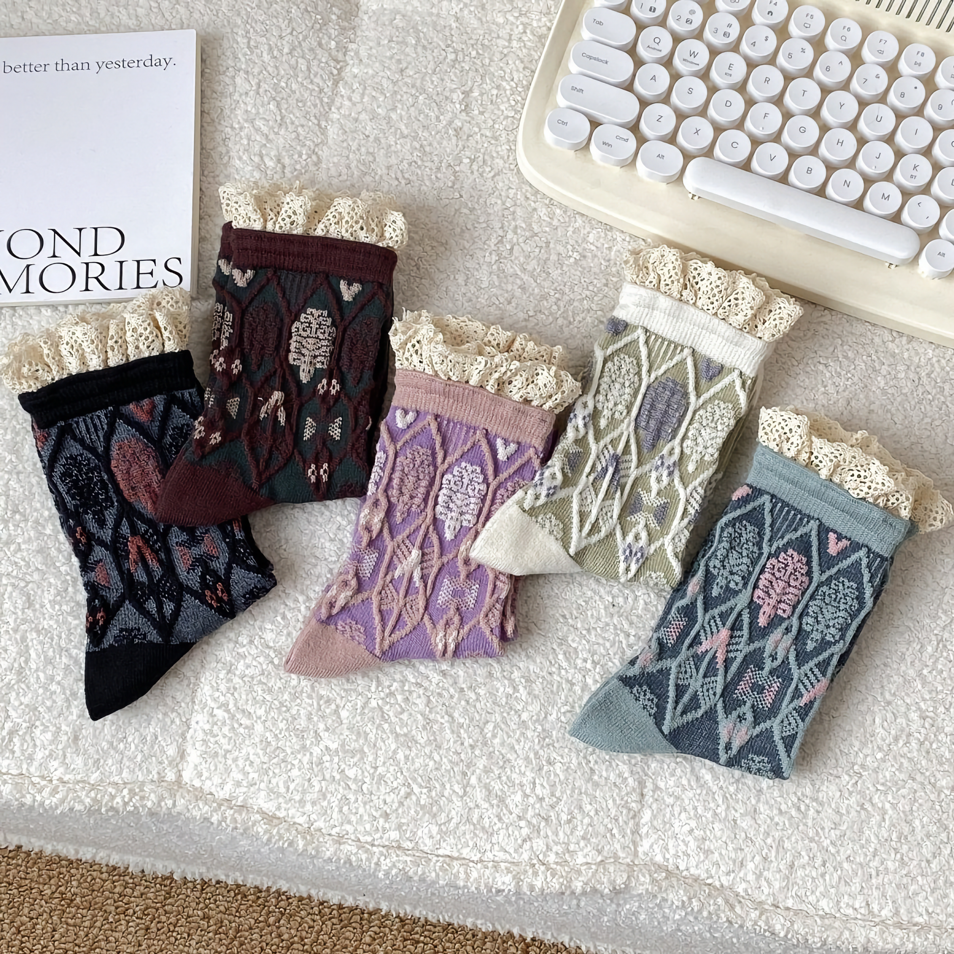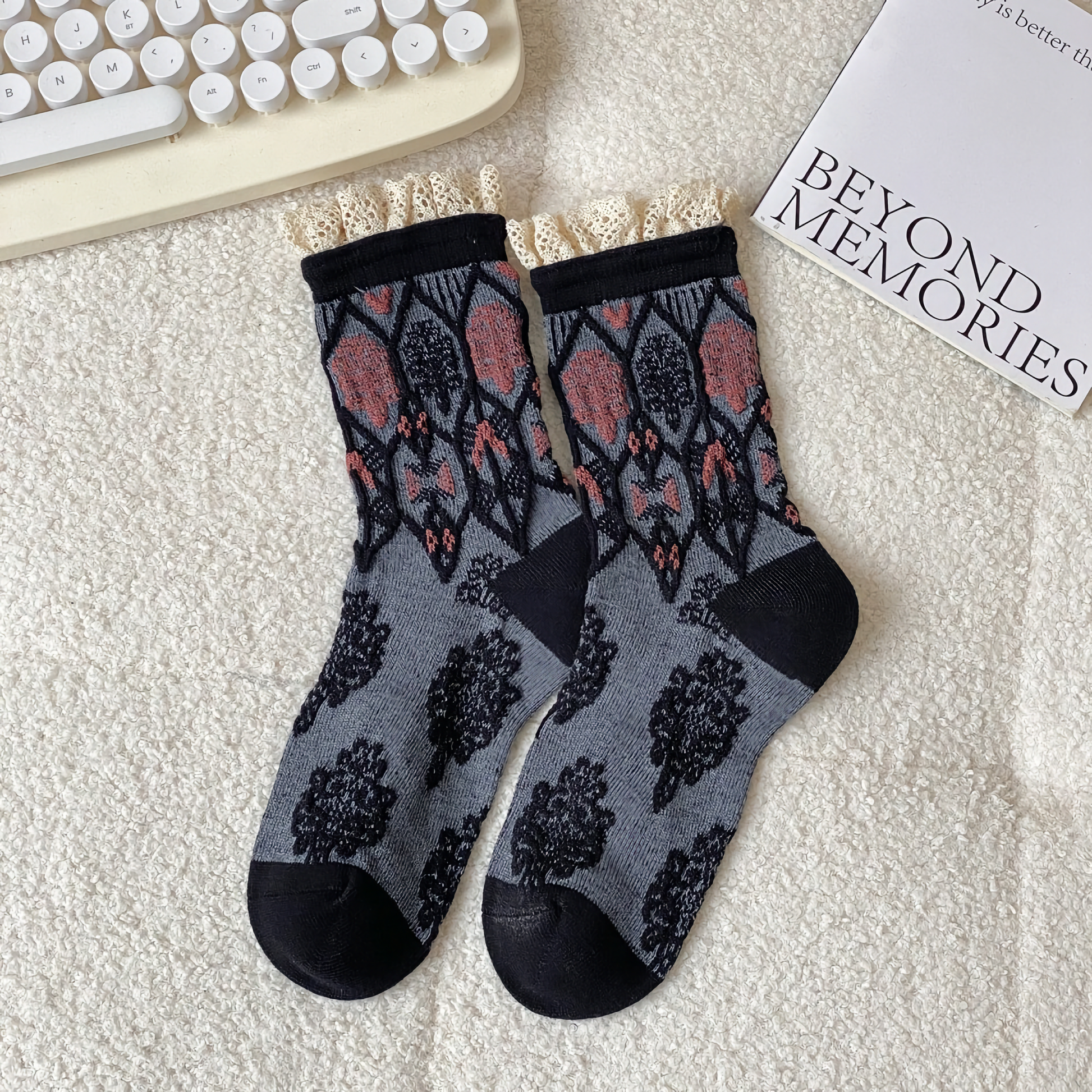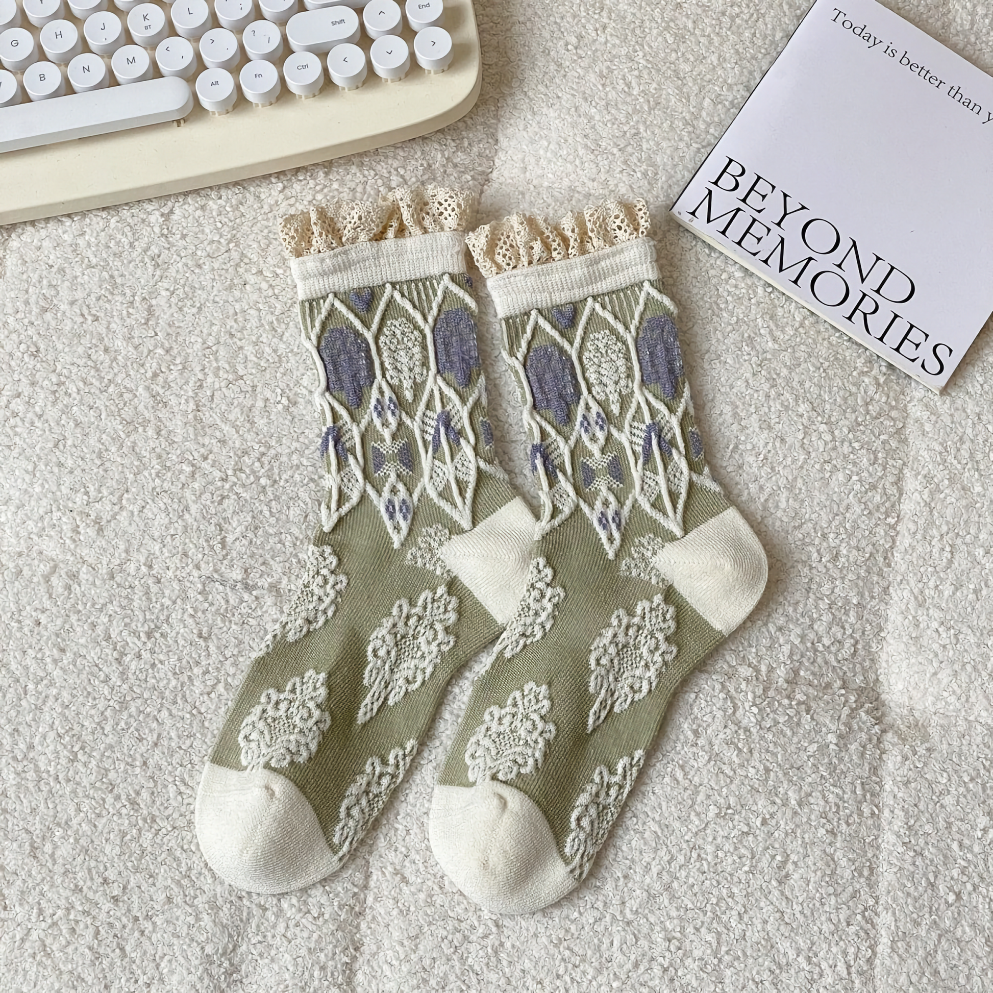 Add a touch of elegance with our vintage lace-trimmed cotton crew socks for women. These stylish and comfortable socks are perfect for any occasion.